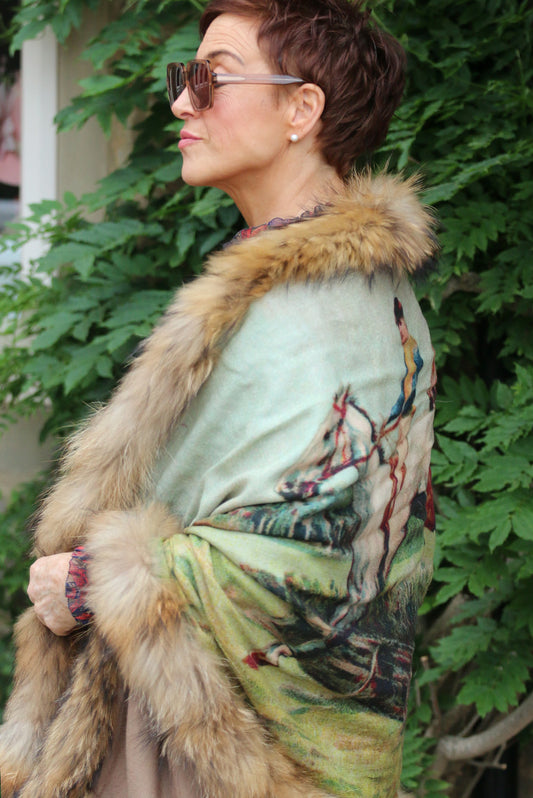 Double sided cashmere and vintage fur wrap