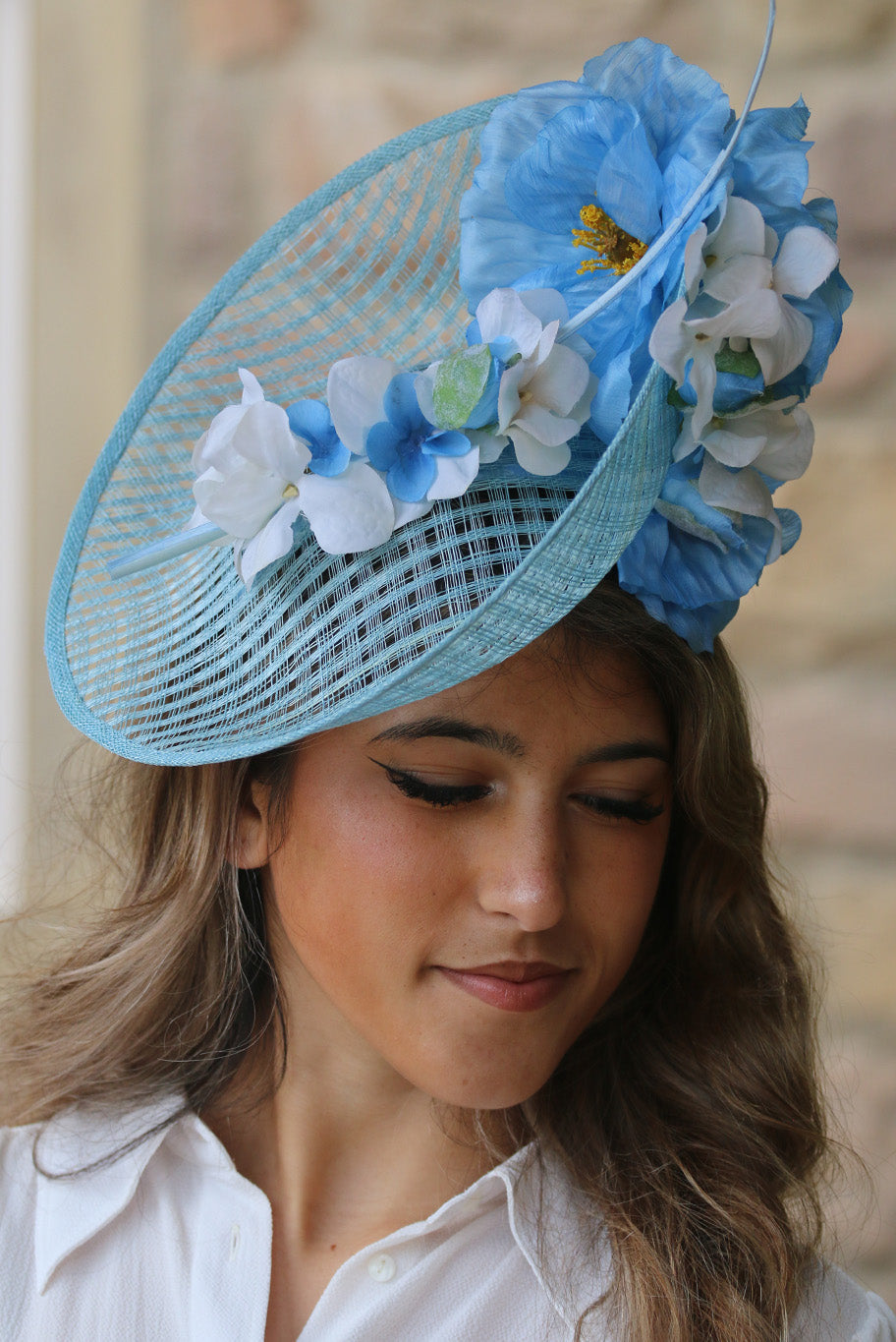 This cornflower blue headpiece combines vibrant color with expert craftsmanship to create a striking accessory. Its elegant design enhances any outfit, making it a perfect choice for adding a refined pop of colour to formal events and special occasions.