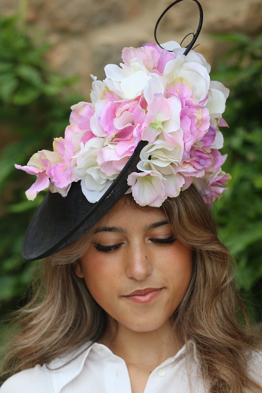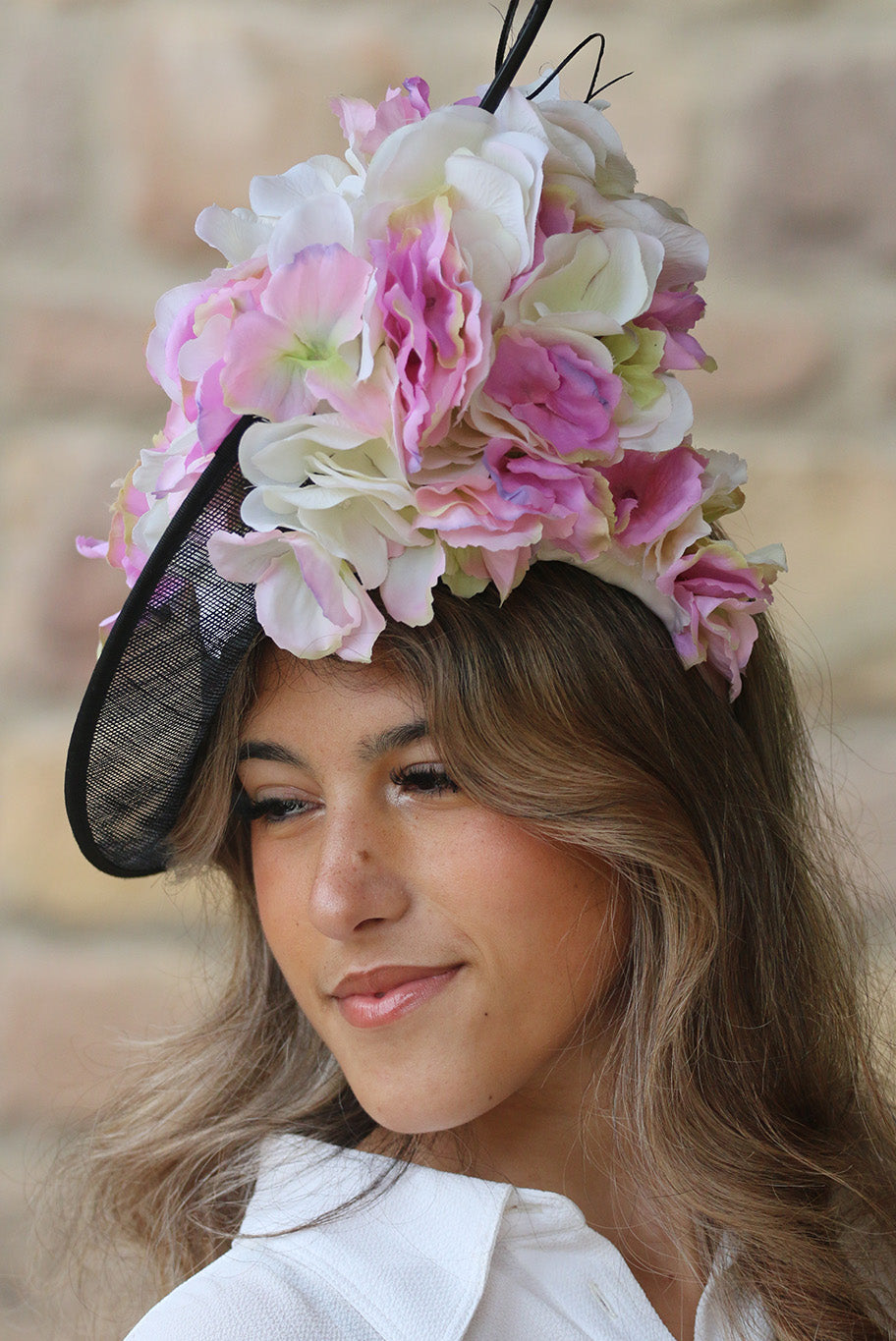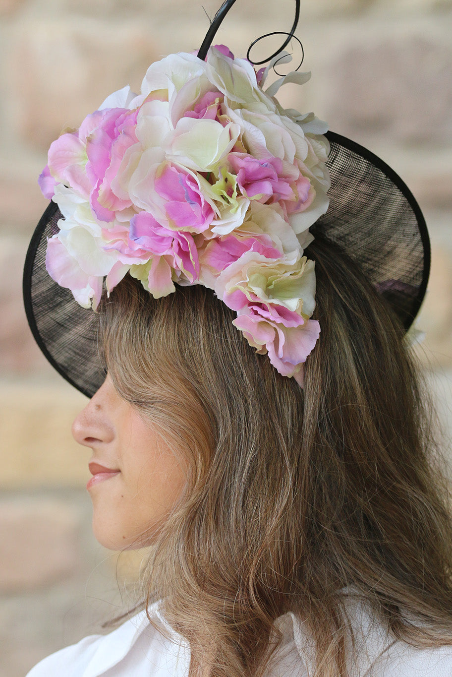 This gorgeous Black sinamay disc fascinator is adorned with delicate pink and off-white flowers, expertly crafted to blend classic elegance with contemporary style. Its refined design makes it an exceptional accessory for sophisticated occasions.