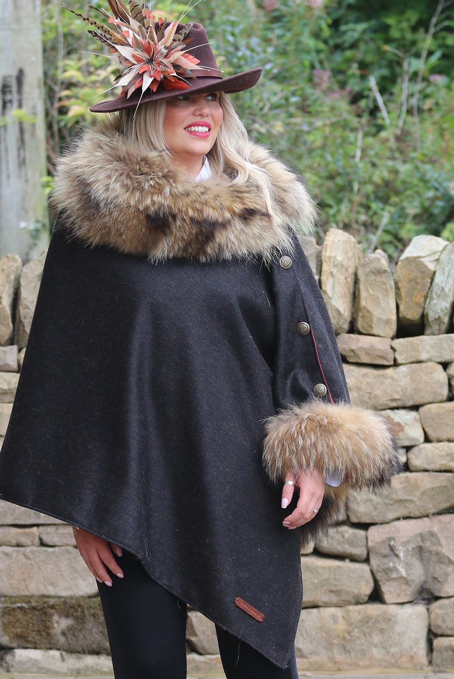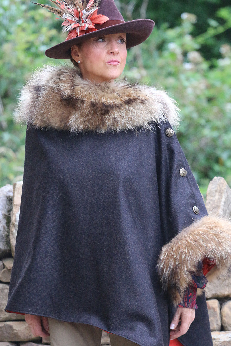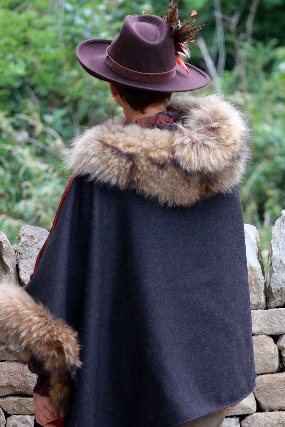 Experience country couture at its finest with the exquisite Le Jabot Charnie cape. Elegantly crafted from sustainable, locally-sourced materials, this timeless piece is made from dark brown 100% wool tweed and featuring a luxurious natural coloured fur collar and attached cuff, this fully lined cape is finished with antique buttons and meticulously handcrafted in England.