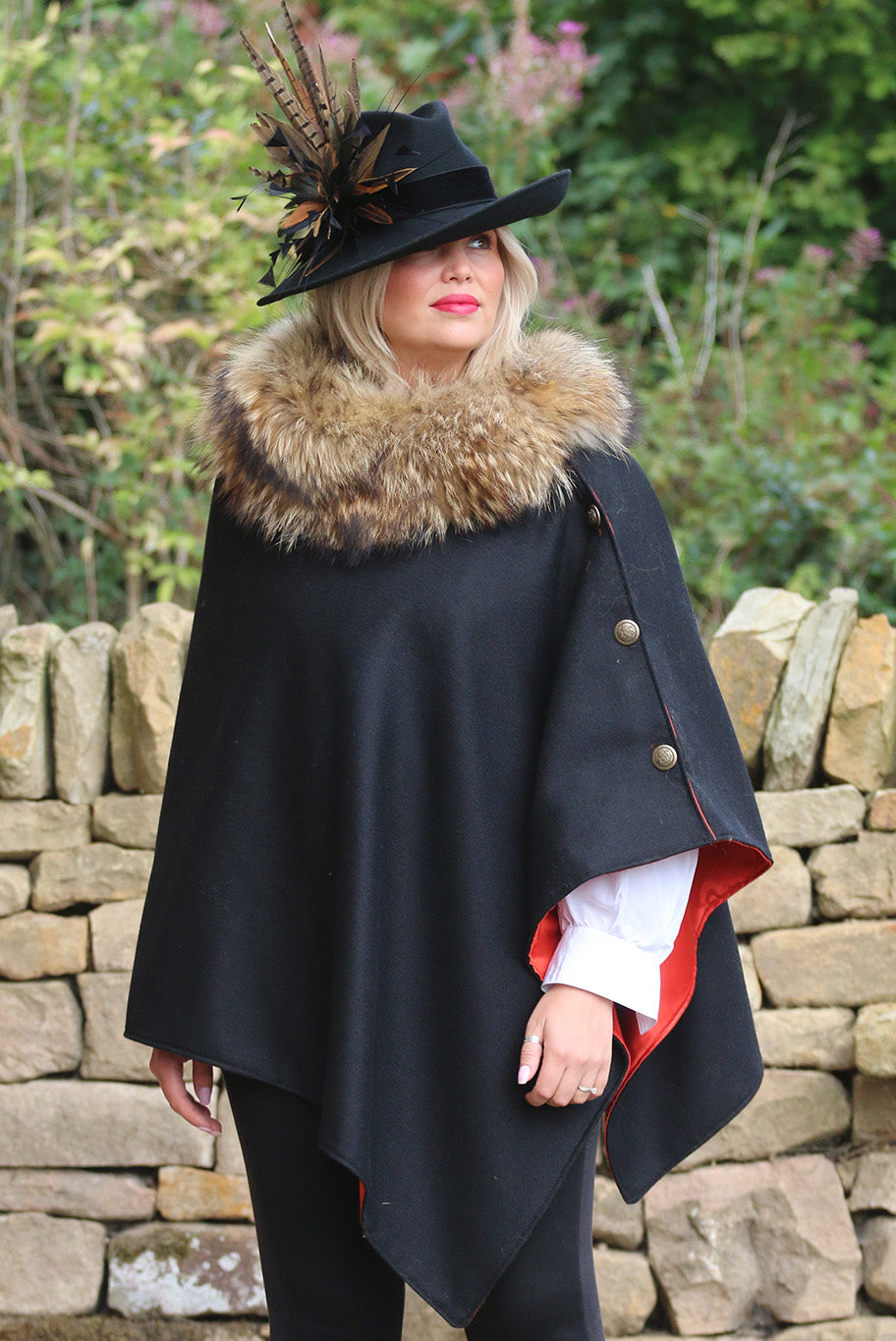 Look truly amazing in one of our most striking and distinctive combinations of black 100% British wool tweed with natural super deluxe fox fur collar, fully lined and complete with antiqued stags head buttons.