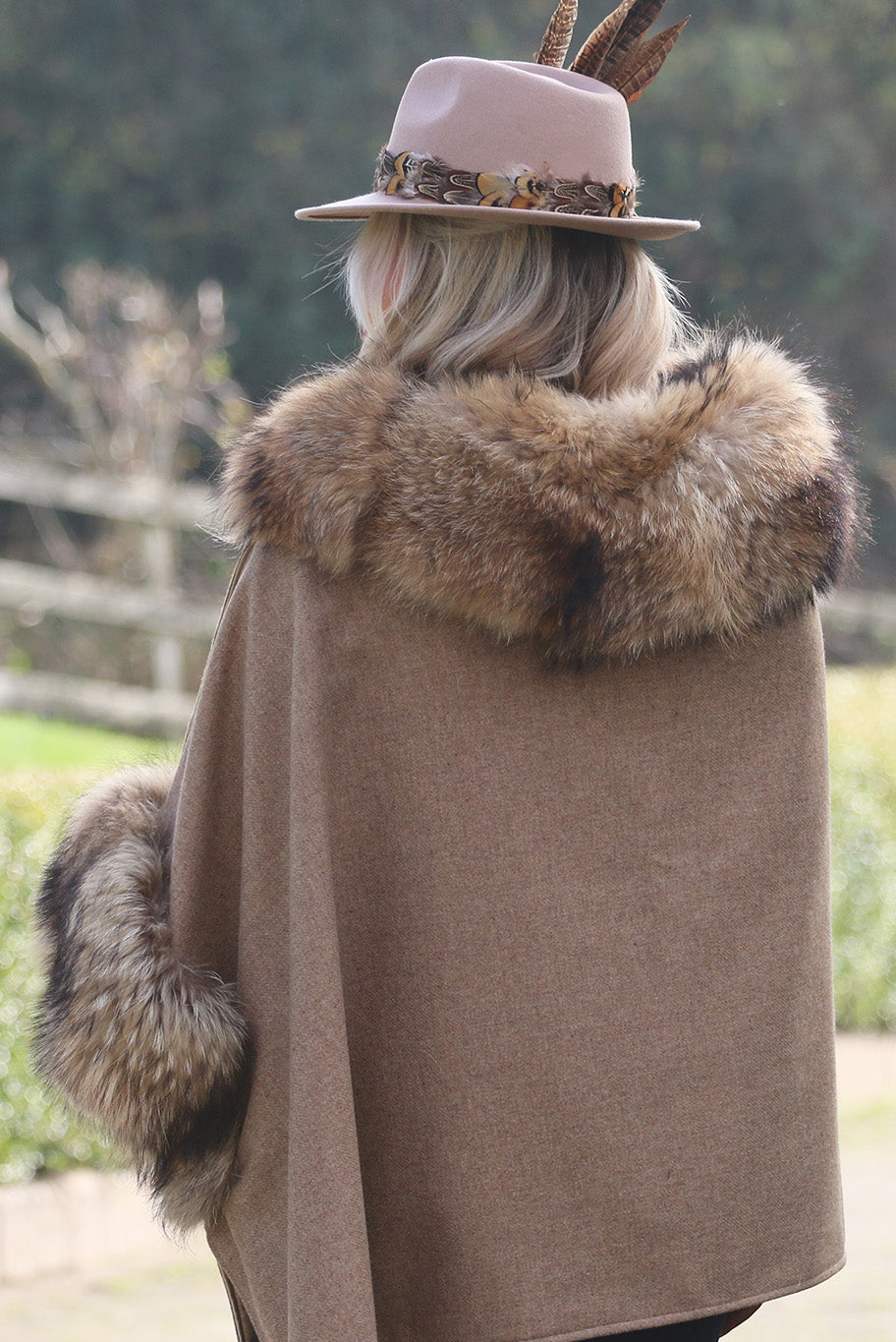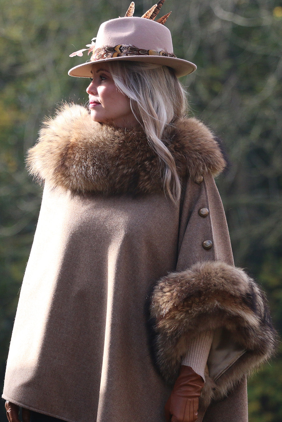 The Le Jabot Langon cape is classic and beautiful to wear, made with the finest materials, sustainable and sourced within the United Kingdom. Colour, tan herringbone 100% wool tweed, fully lined, deluxe size natural fur collar and matching cuff, distinctive antiqued buttons. Hand made in England.