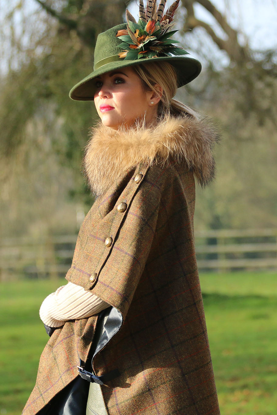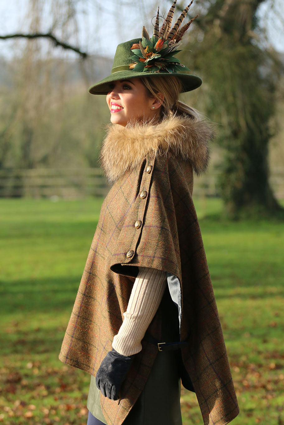 This stunning hand made chestnut brown 100% British wool tweed cape with purple, orange and green overcheck pattern, is fully lined and finished with deluxe natural fur collar and navy leather side strap. Antiqued styled buttons along the arm complete this timeless and elegant look, ideal for many different occasions.
