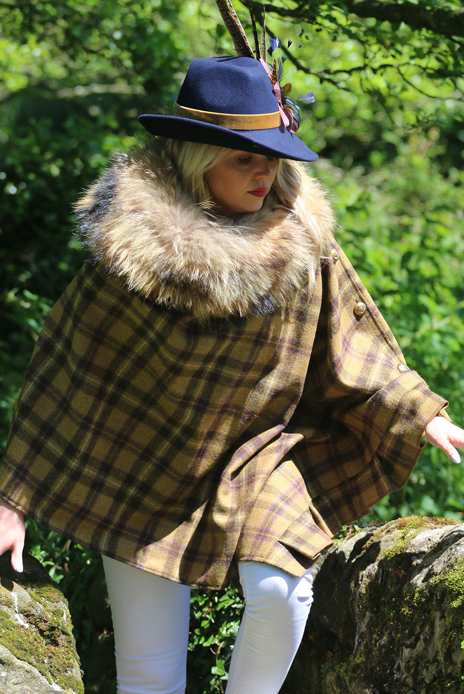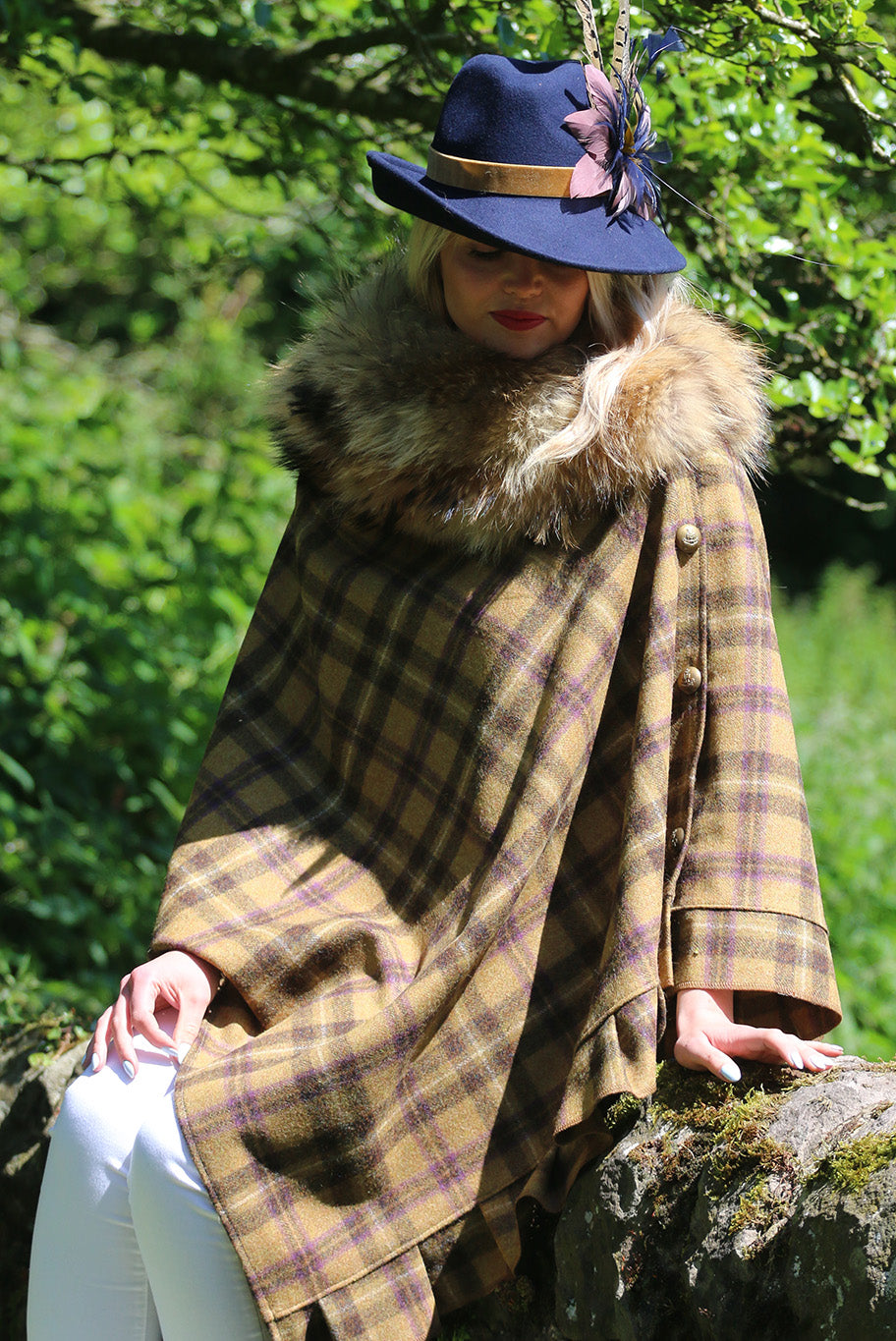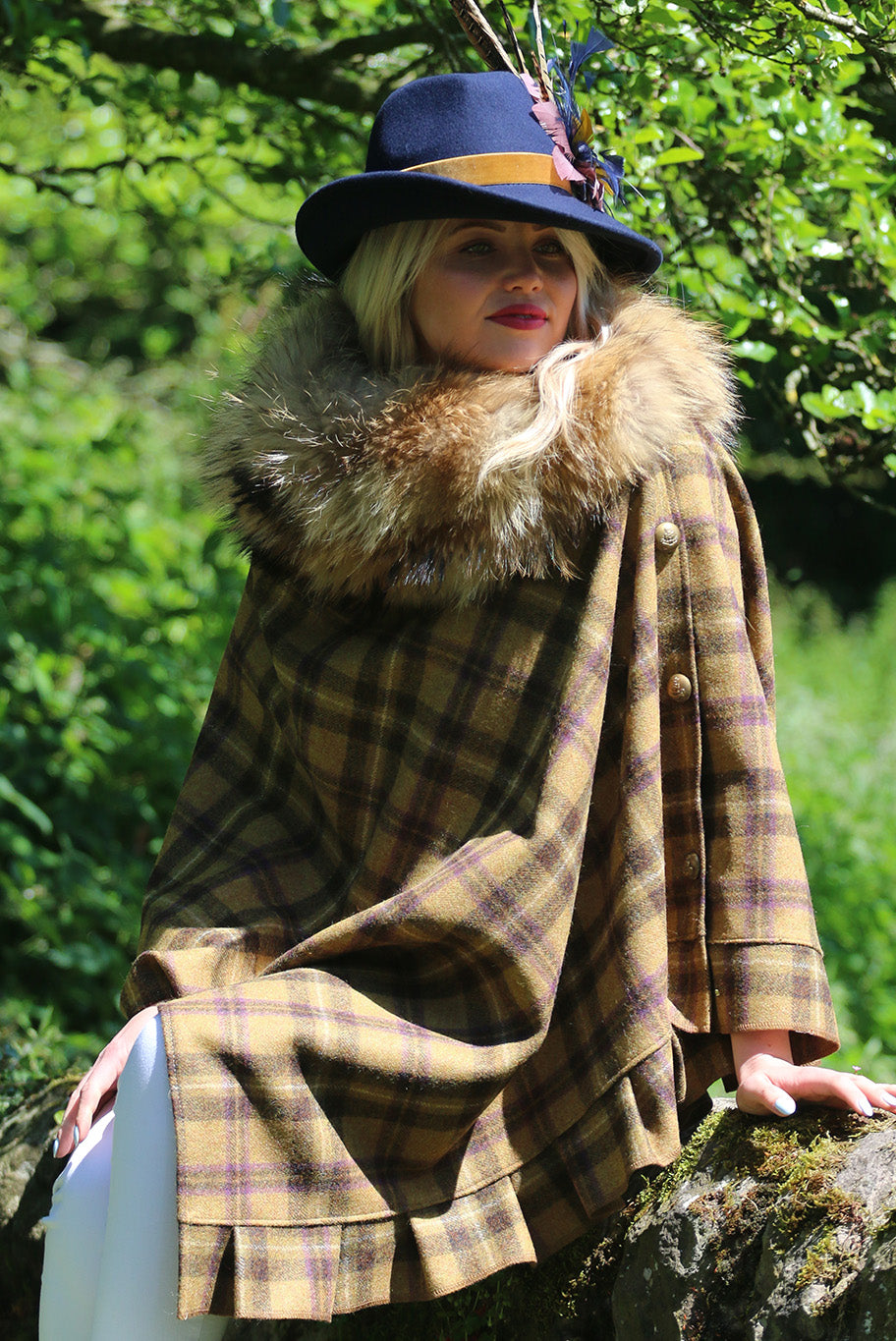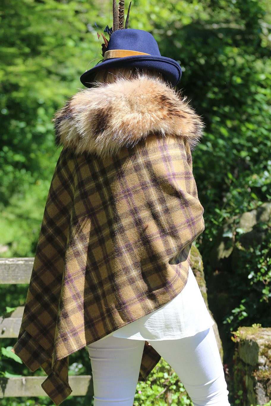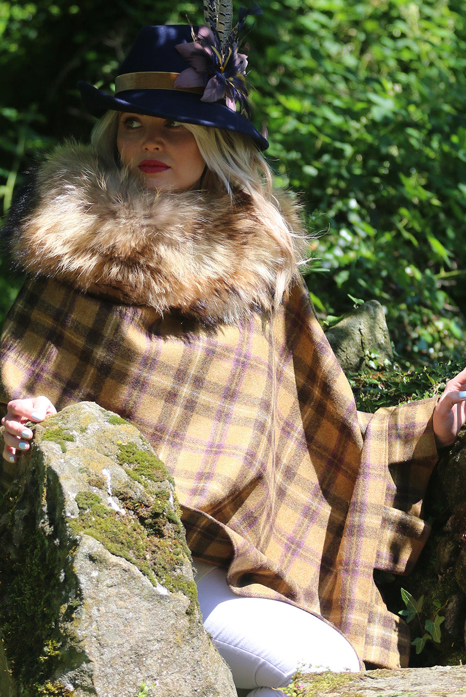 The Le Jabot Neve cape is classic and beautiful to wear, made with the finest materials, sustainable and sourced within the United Kingdom. Colour, tan with mauve overcheck, 100% wool tweed, unlined, deluxe size natural fur collar, distinctive tweed frill edge and antiqued buttons. Hand made in England.