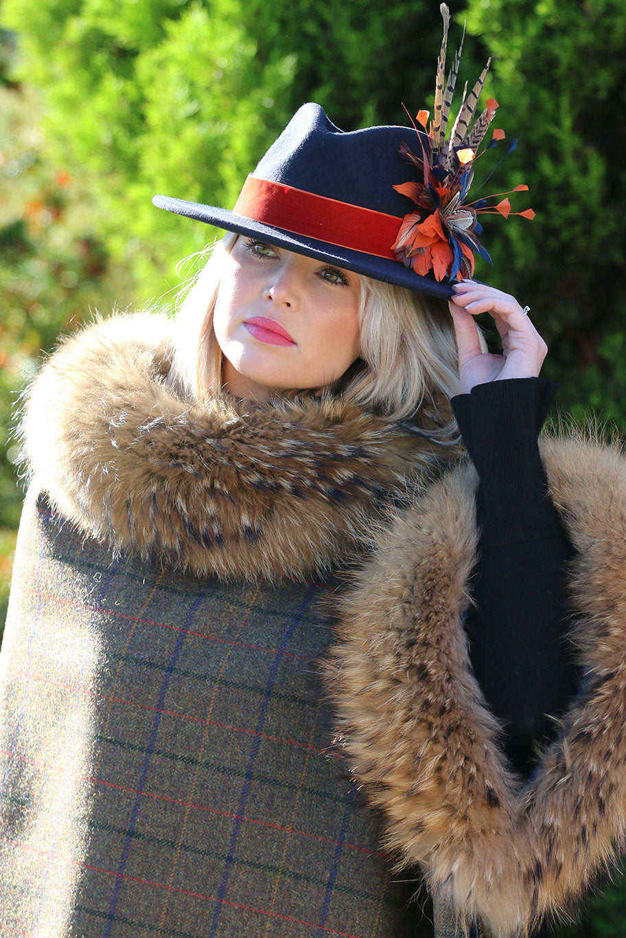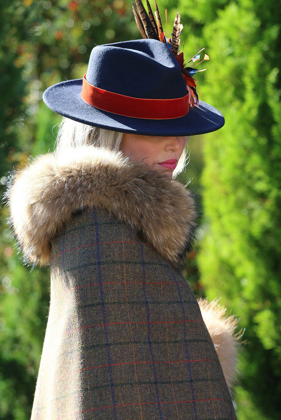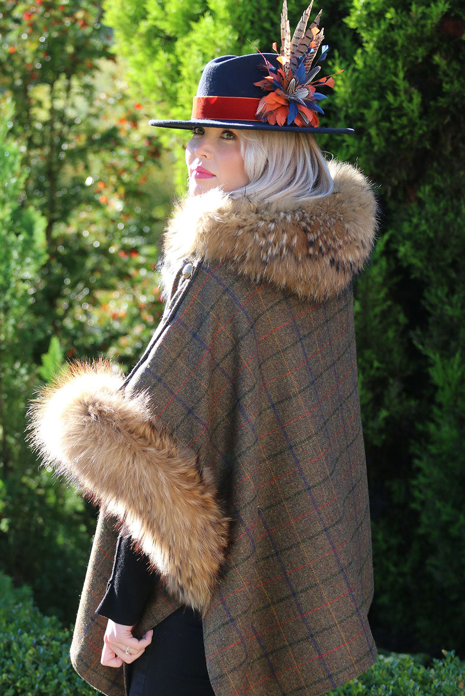 The Le Jabot Tregaron cape is outstanding country couture. Classic and beautiful to wear, made with the finest materials, sustainable and sourced within the United Kingdom. Colour, brown green with burnt orange & dark brown overcheck, 100% wool tweed, fully lined, deluxe size fur collar and attached cuff, antiqued buttons. Hand made in England.