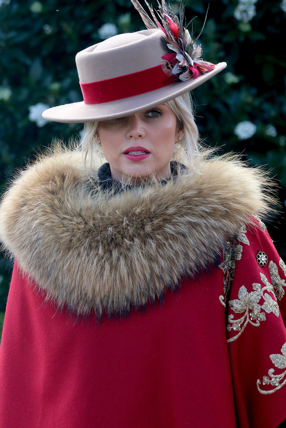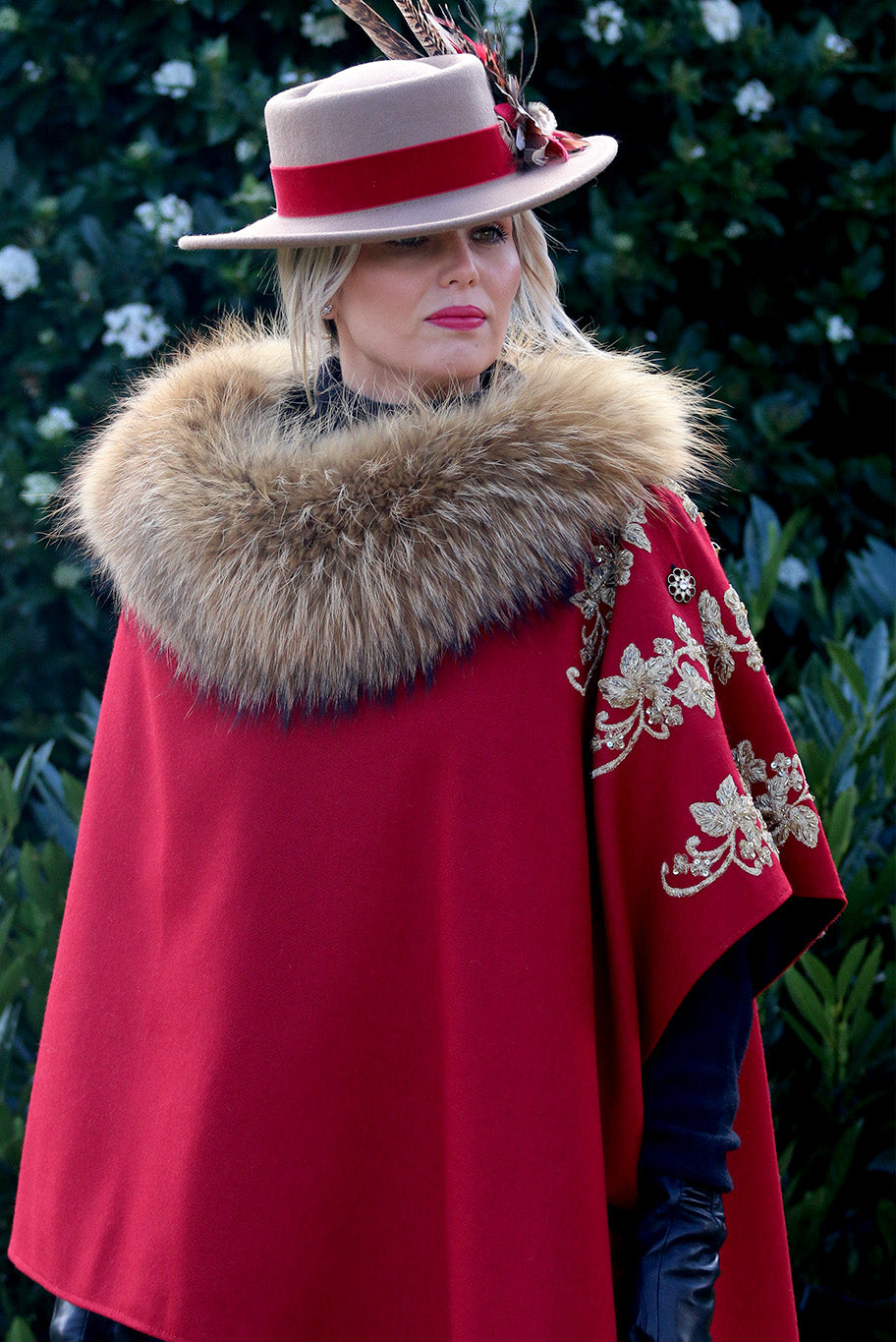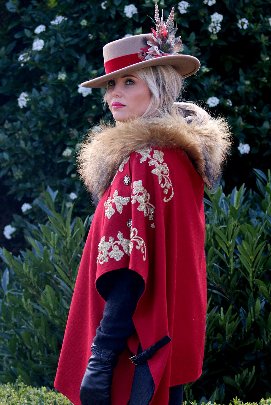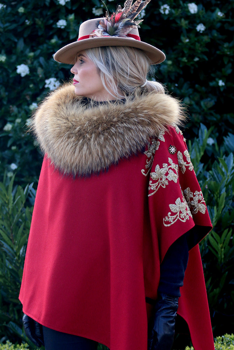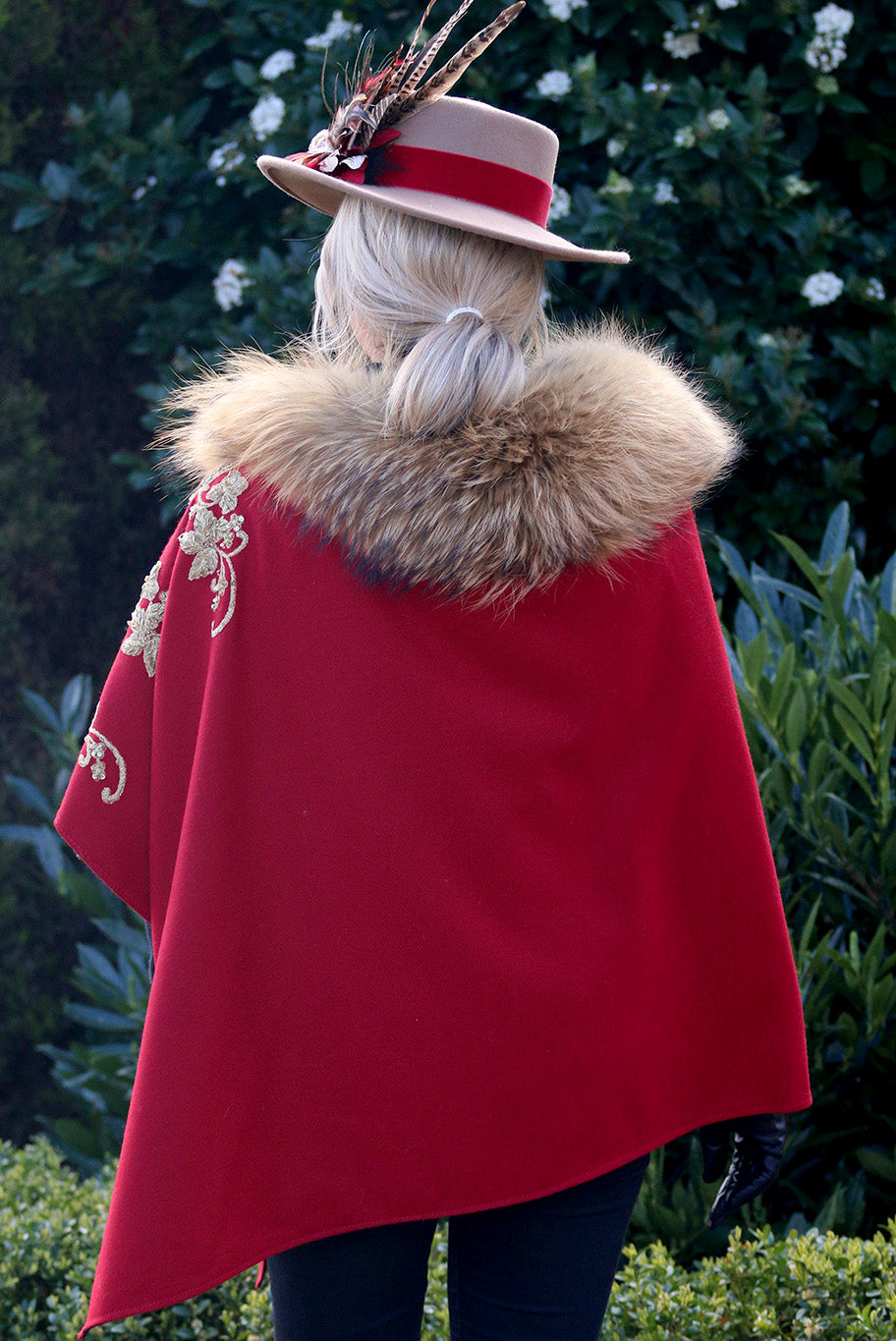 Unique to Le Jabot & Stock Co. the beautiful embroidered Villeroy cape is classic country couture. Timeless style and beautiful to wear, made with the finest materials, sustainable and sourced within the United Kingdom. Colour, scarlet red 100% merino lambswool, fully lined, deluxe fur collar and antiqued buttons. Hand made in England.